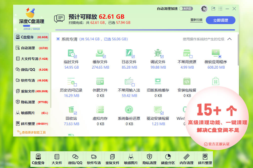 一键清理C盘垃圾,电脑小白用户专属。同时,还提供AI自定清理加速、大文件搬家、软件搬家/压缩、重复文件清理、磁盘分区、敏感图片扫描清理等深度智能清理功能,帮助用户清理电脑垃圾文件,深度释放磁盘空间,提升电脑运行速度。